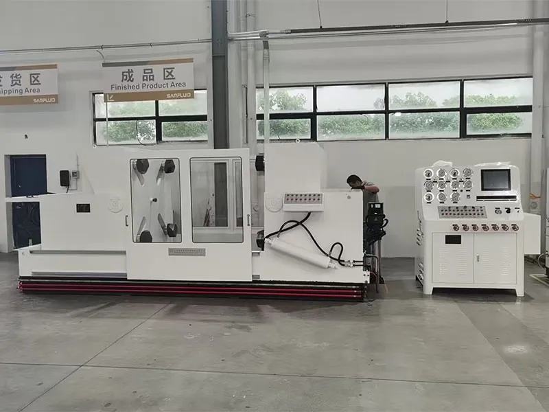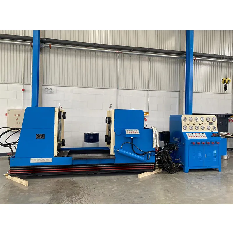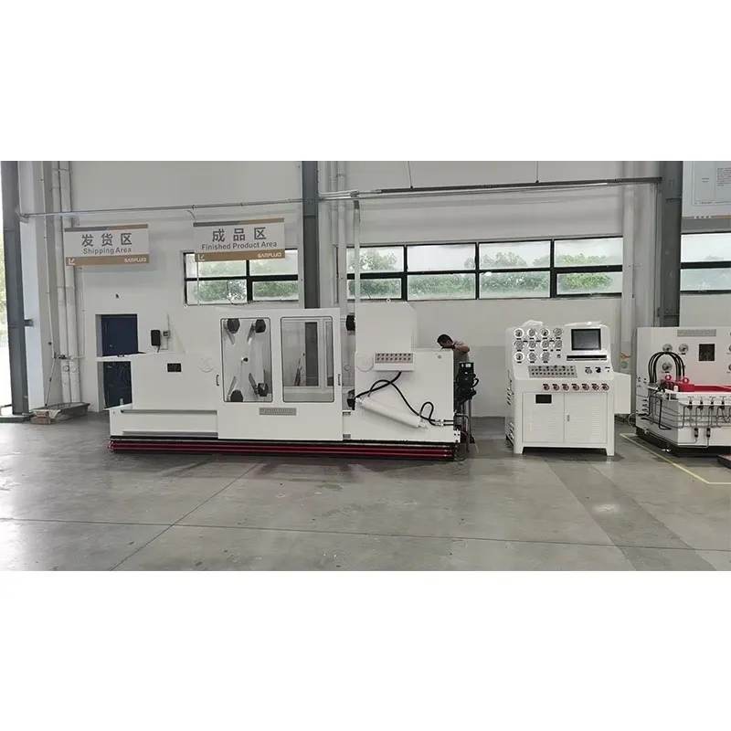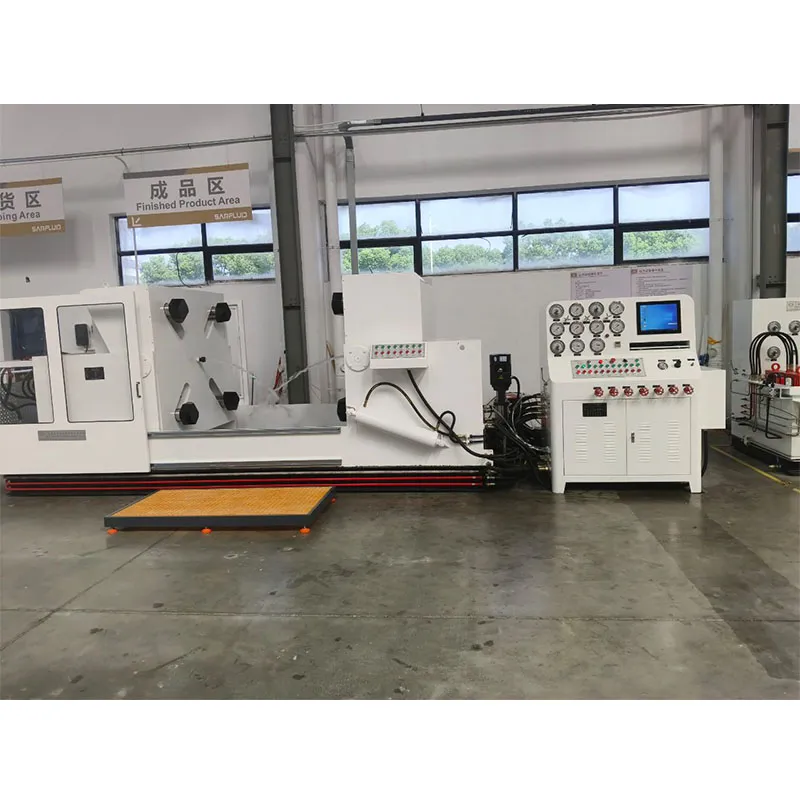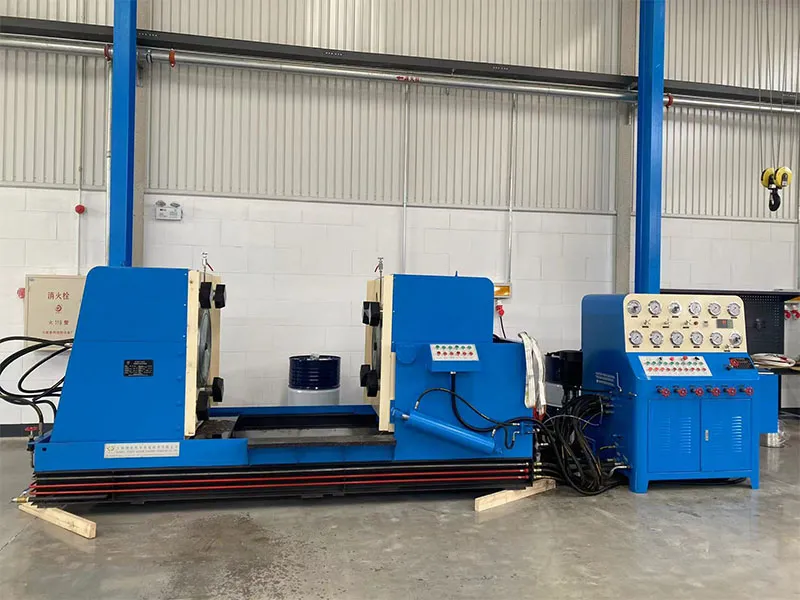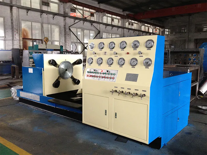 Гидравлический испытательный стенд для клапанов обжимного типа оснащён левой и правой рабочими платформами. На каждой платформе установлен подвижный механизм с прижимными лапами, положение которых синхронно регулируется в зависимости от размера фланца испытываемого клапана. Левая платформа может перемещаться в горизонтальной плоскости для адаптации к конструктивной длине клапанов различных типоразмеров и классов давления. Правая платформа поворачивается на 90°, что удобно для контроля утечек при испытании на одностороннюю герметичность. Высокое давление в гидросистеме, необходимое для создания усилия зажима, обеспечивается собственным гидравлическим усилителем стенда. Испытательная система подачи воды состоит из низконапорного насоса большого расхода, высоконапорного насоса малого расхода, а также трубопроводов и запорной арматуры. Во время испытания сначала включается низконапорный насос для заполнения полости клапана испытательной средой. После заполнения система автоматически активирует высоконапорный насос для нагнетания давления. Когда давление среды достигает предварительно заданного значения, высоконапорный насос автоматически отключается, и система переходит в режим стабилизации давления с отсчётом времени (время выдержки задаётся оператором). По истечении заданного времени загорается соответствующий световой индикатор, и звуковой сигнал оповещает об окончании цикла.